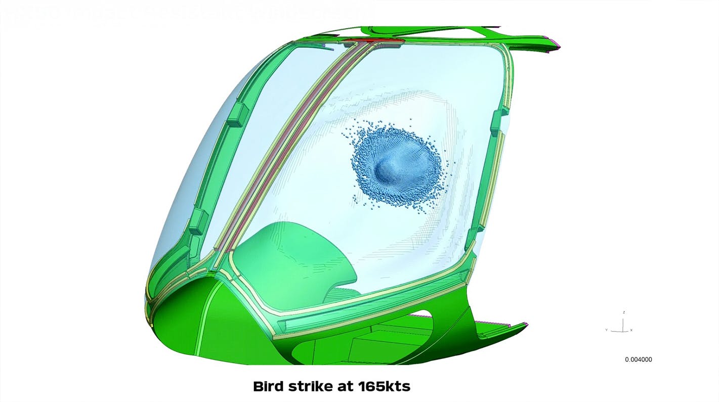A unique challenge for the HX50's clean aerodynamics is achieving bird-strike resistance without external mechanical fasteners. We are developing a robust bonded joint configuration capable of handling the large deformation of a bird strike. Extensive simulations and material tests indicate this elegant, fastener-free solution will be successful.