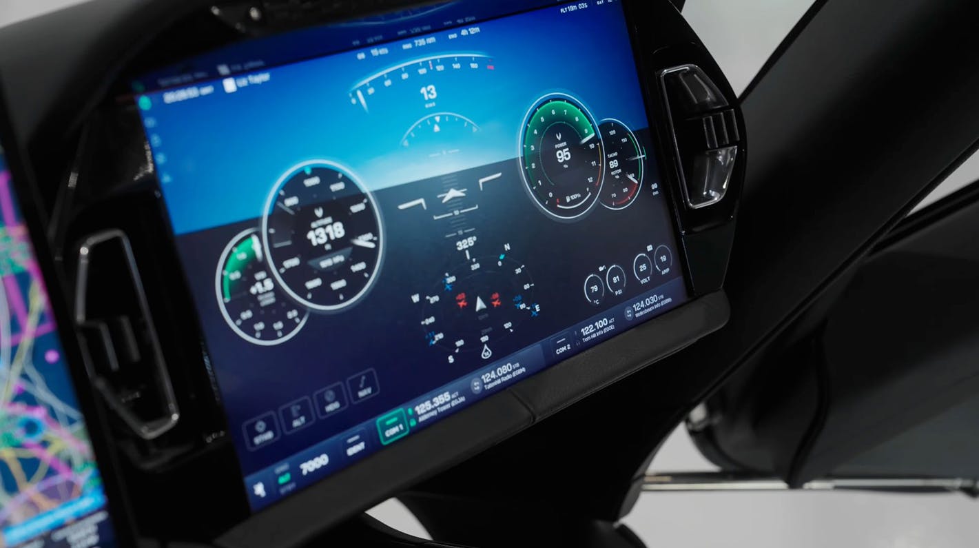 • Primary Instruments: A large artificial horizon is flanked by clear, bold airspeed and attitude tapes. The Horizontal Situation Indicator (HSI) integrates a compass, wind bug, and ADS-B traffic display.